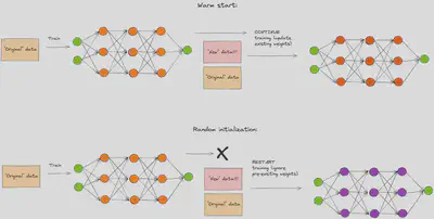 The figure illustrates how the new model uses the weights from the previous model as its initial values. This allows the new model to train on both the “Original” data, which it has already seen, and the new data, which it has not encountered before. In contrast, the randomly initialized model treats the entire data as unfamiliar and starts from scratch.
