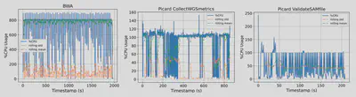 | Figure 2. CPU utilization pattern of BWA, Picard’s CollectWGSMetrics, and Picard’s ValidateSamFile collected by GenScale. y-axis: (num. cores) x 100%, x-axis: time elapsed in seconds. |